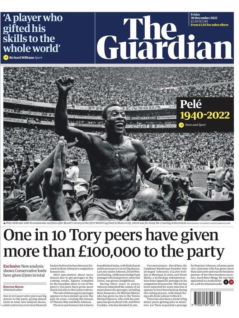Daily Mirror: "Seeing Pelé at full speed was the most beautiful sight in football - long before that adjective defined the game. Even today his name is not only synonymous with beauty, but also with excellence, breathtaking skill and the highest level of sportsmanship. Long before Maradona, Ronaldo and Messi, there wasn't even a debate about the greatest footballer of all time. Every fan knew it was Pelé and they adored him."
